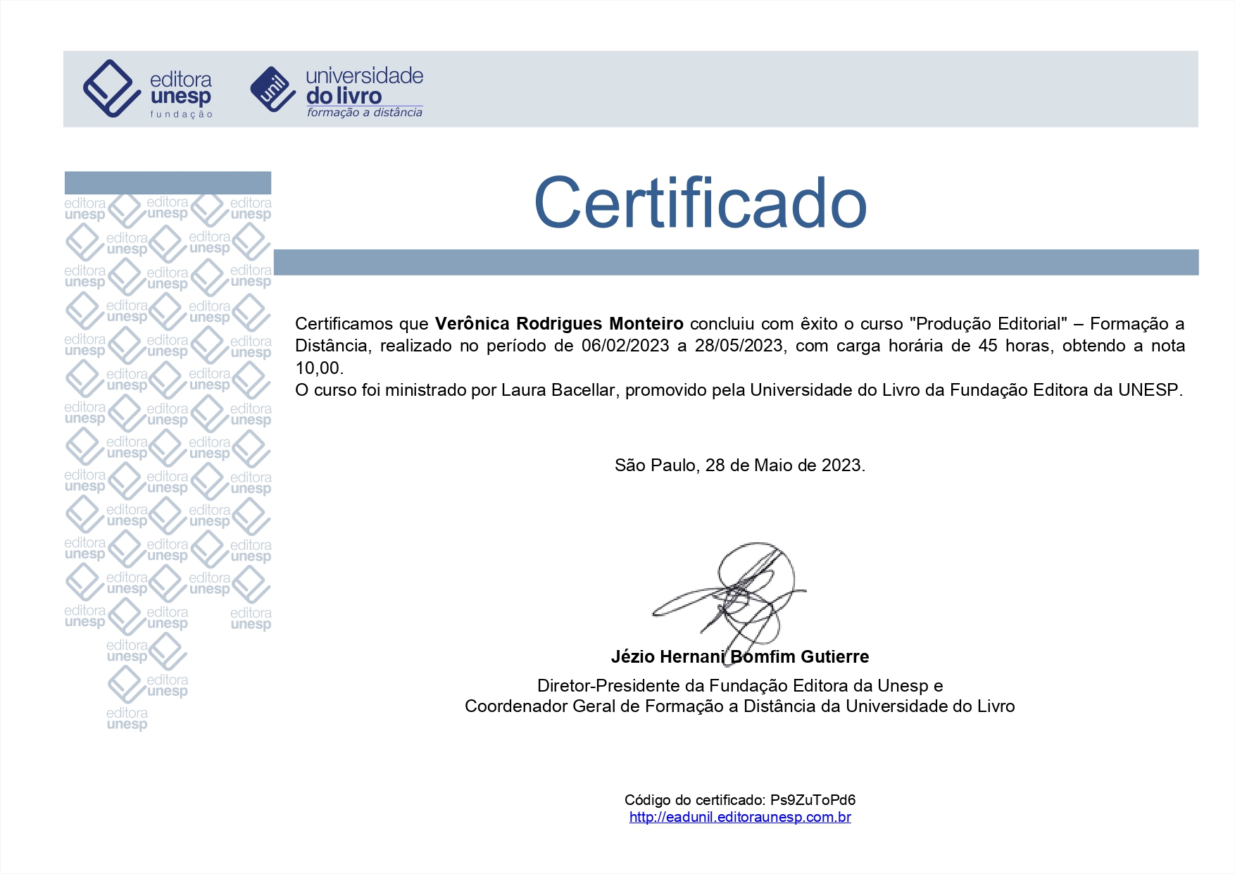 Certificado do Curso de Produção Editorial, ministrado pela UNIL-UNESP.
